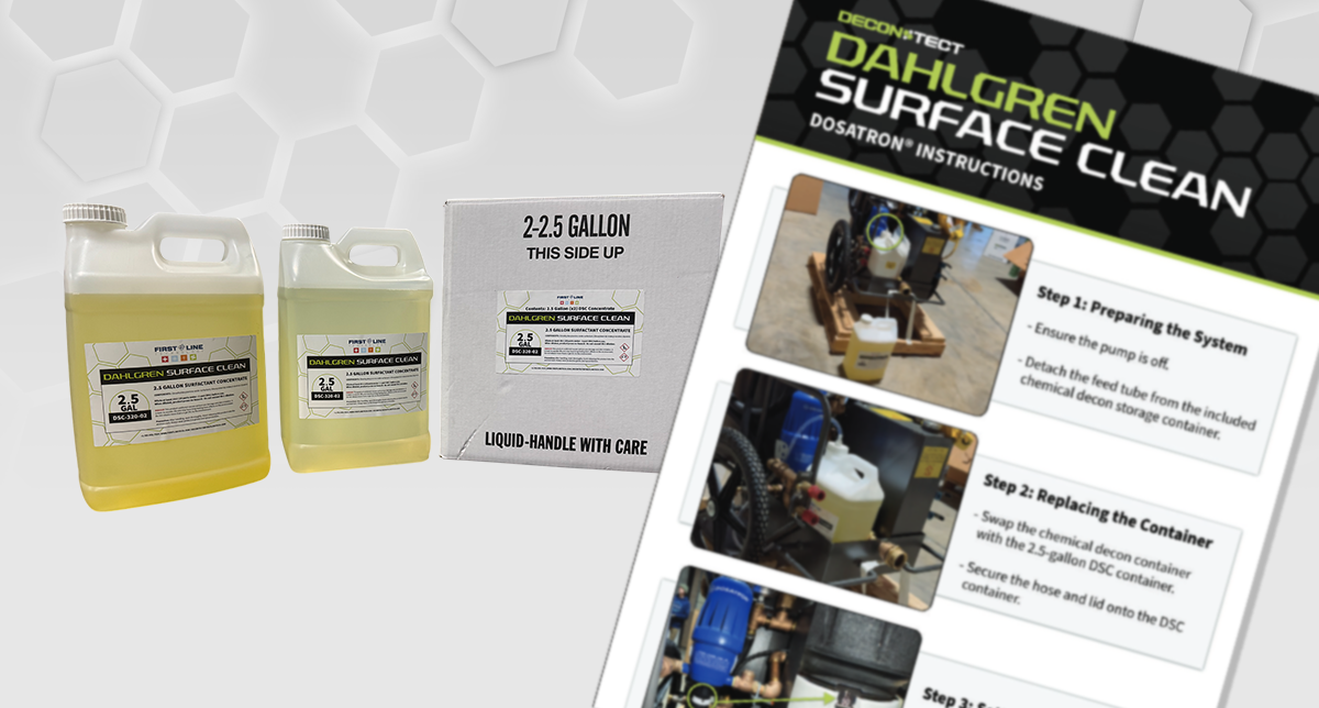 Dahlgren Decon is a proven solution to destroy chemical warfare agents (CWAs), toxic industrial chemicals (TICs), toxic industrial materials (TIMs), synthetic opioids, and emerging threats. Designed for efficiency, it works quickly to eliminate threats in minutes.